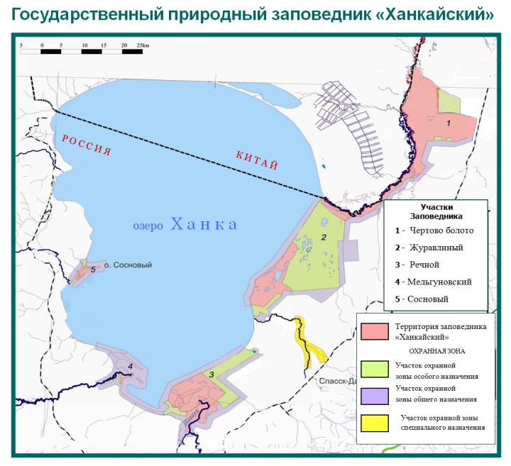 В апреле 1996 года между Правительствами Российской Федерации и Китайской Народной Республикой подписано соглашение о создании на базе Ханкайского заповедника в России и китайского заповедника «Синкай-Ху» международного российско-китайского заповедника «Озеро Ханка». ОписаниеНациональная задача заповедники сохранение природного комплекса, находящегося под защитой международной конвенции «О Водно-болотных угодьях, имеющих международное значение главным образом в качестве местообитании водоплавающих птиц» (Рамсарская конвенция, 1971 год), а так же улучшение очень не простой экологической обстановки в бассейне озера. Территория заповедника разделена на 5 изолированных участка, расположенных в 5 административных районах (Ханкайском, Хорольском, Черниговском, Спасском и Кировском). При этом в заповедник не вошел ряд водно-болотных угодий, имеющих преимущественное значения для выполнения Российской стороной обязательств по конвенции. За его пределами остались 2/3 основных охраняемым видов региона (японский и даурский журавли, дальневосточный аист). Данная территория попадает под действие международных соглашений: Советско (Российско) — Японской конвенции «Об охране перелетных птиц и птиц, находящихся под угрозой исчезновения, и среды их обитания» (с 1973 продлена до 1991); Советско-Корейской (КНДР) конвекции «Об охране перелетных птиц и птиц, находящихся под угрозой об исчезновения, и среды их обитания» (1987); Советско (Российско-) — Корейской (Республика Корея) конвекции «Об охране перелетных птиц и птиц, находящихся под угрозой исчезновения, и среды их обитания» (1994). Огромная проблема для заповедника авиаполигон площадью 16 000 га. В пределах охраняемой зоны. Бомбометания, проводимые во все сезоны года, являются мощным фактором беспокойства для гнездящихся здесь птиц и источником травянисты пожаров. Флора и фаунаЗаповедник включает в себя болотную местность (травянистые болота и луговые травянистые сообщества) по берегам озера Ханка, а так же его заливы и прилегающую полосу акватории. Частично сохранившиеся, некогда обширные плавни по уникальности растительного мира не имеют аналогов. На территории произрастает 616 видов сосудистых растений, относящихся к 343 родом из 107 семейств, в том числе 49 редких и исчезающих видов (лотос Комарова, эвриала устрашающая, бразения Шребера и другие), а так же 523 вида водорослей. Здесь зарегестрированны 333 вида птиц. На территории России нет другого сопоставленного участка, где обитает столь большое количество птиц, включаемых в Красные книги Международного союза охраны природы (МСОП) и России — 44, из них 11 гнездящихся (в том числе дальневосточный аист, японский и даурский журавли, тростниковая сутора, ходулочник, чернядь Бэра, дикуша, азиатский бекасовидный веретенник, сухонос и колпица), отсутствующие на гнездовании в других заповедниках Дальнего Востока. На территории заповедника обитает 48 видов млекопитающих, в том числе 4 вида, замеченных в Красной книге СССР и России; 7 видов рептилий (в том числе краснокнижная дальневосточная кожистая черепаха, 6 видов амфибий, 60 видов рыб, (из них 2 вида краснокнижных), редких и исчезающих видов насекомых — 12, среди них отсутствующие в других заповедниках края эпикопея и носа. На прилегающей к границе территории Китайской Народной республике в бассейне 